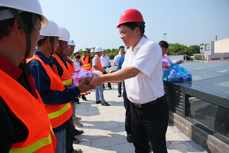 圖為集團(tuán)黨委書記、董事長(zhǎng)周儉慰問紹興水處理公司脫氮工程施工人員