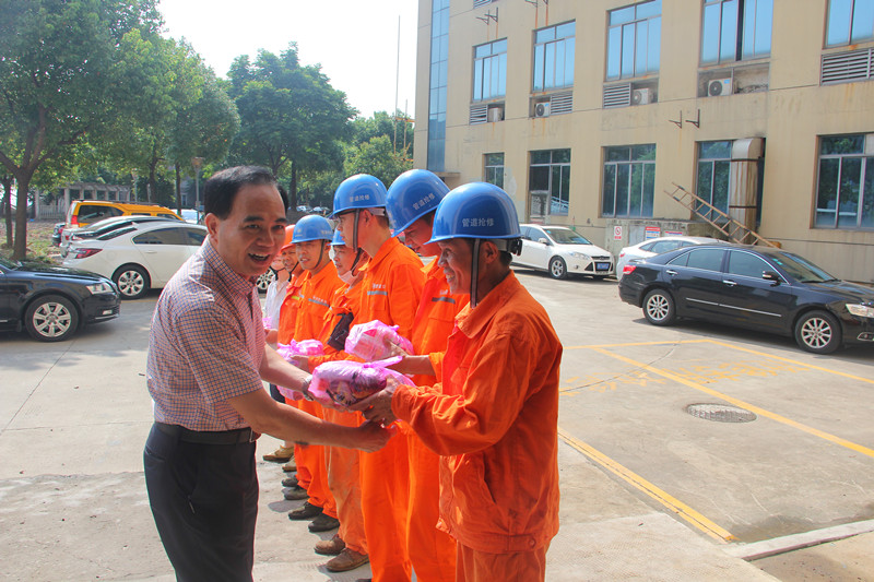 圖為集團(tuán)黨委副書記、總經(jīng)理單寶子慰問排水公司養(yǎng)護(hù)班組工作人員